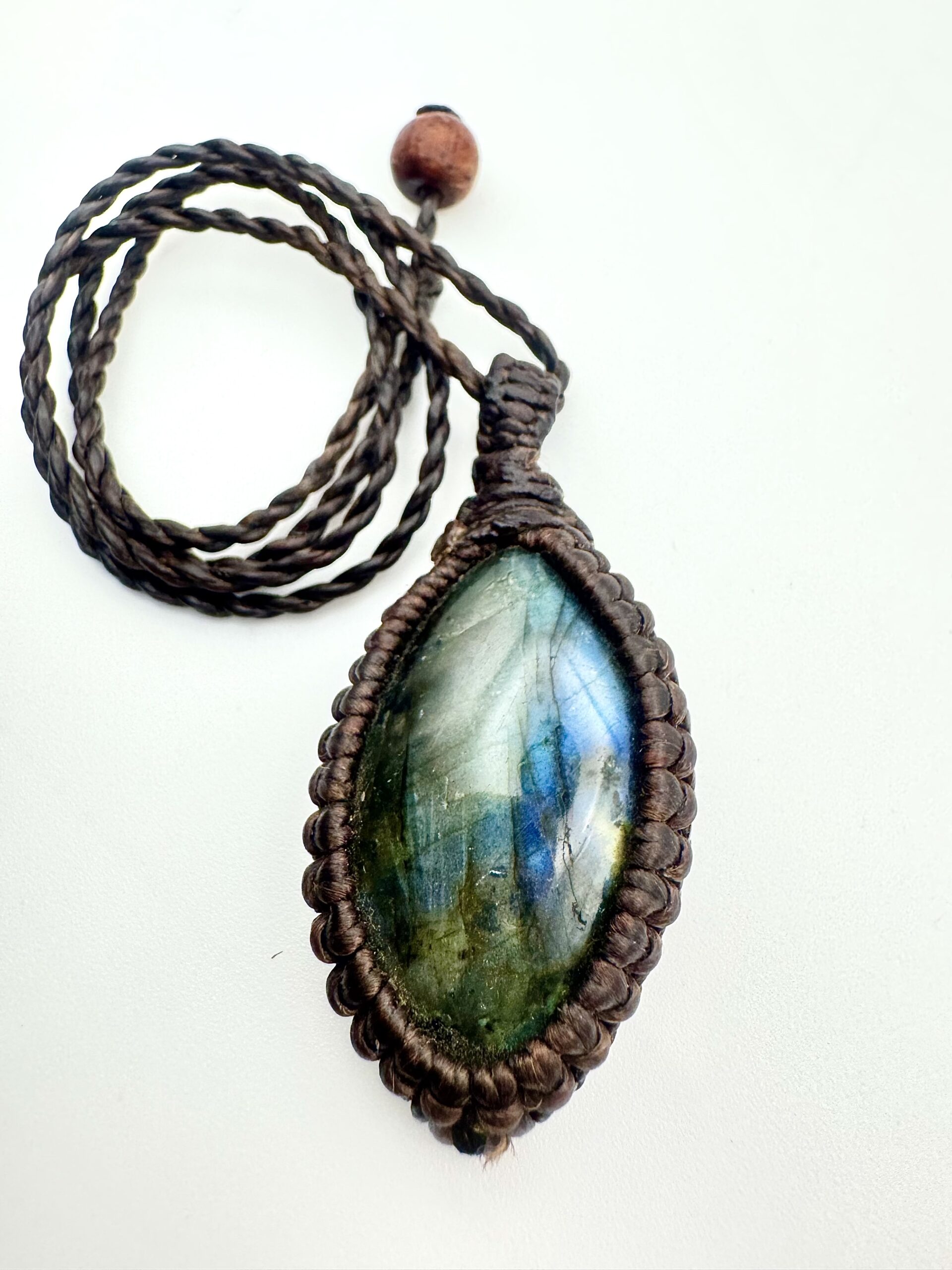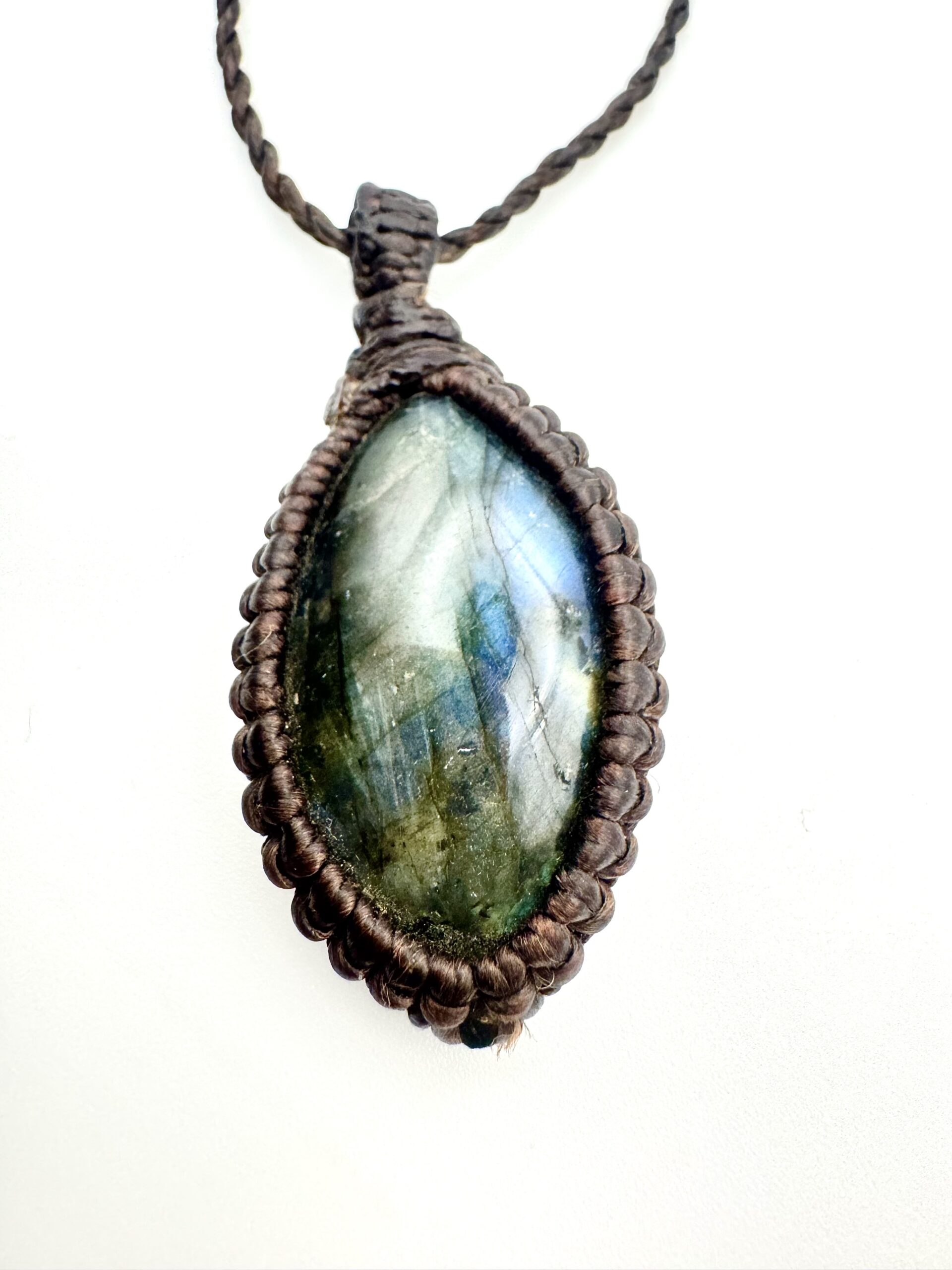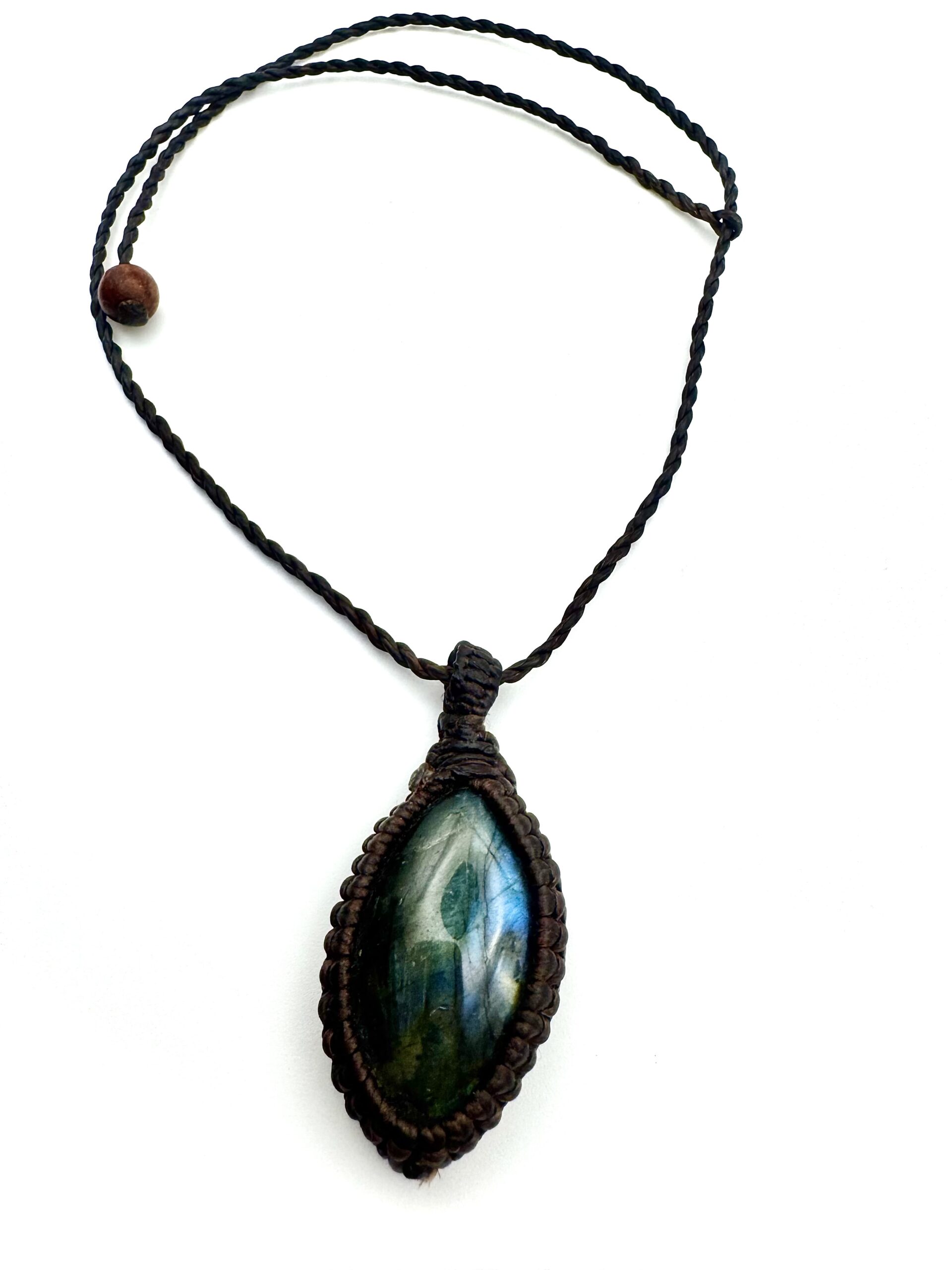 Ten wyjątkowy wisior z naturalnym labradorytem został przywieziony z Tajlandii i ręcznie opleciony na rzemieniu. Każdy kamień jest jedyny w swoim rodzaju i zachwyca charakterystycznym, subtelnym połyskiem, który pojawia się w świetle niczym ukryta magia natury.